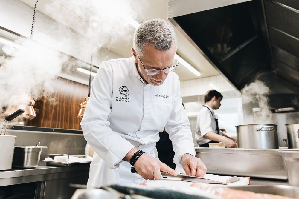 C’est le coup de feu et pourtant, pas d’affolement en cuisine. Chacun s’active, dans la précision du geste. Superbement dressées, les assiettes sortent au bon rythme et à température. Ce tempo régulier et ce souci de perfection doivent beaucoup à la personnalité du chef : Mathieu Aumont.
